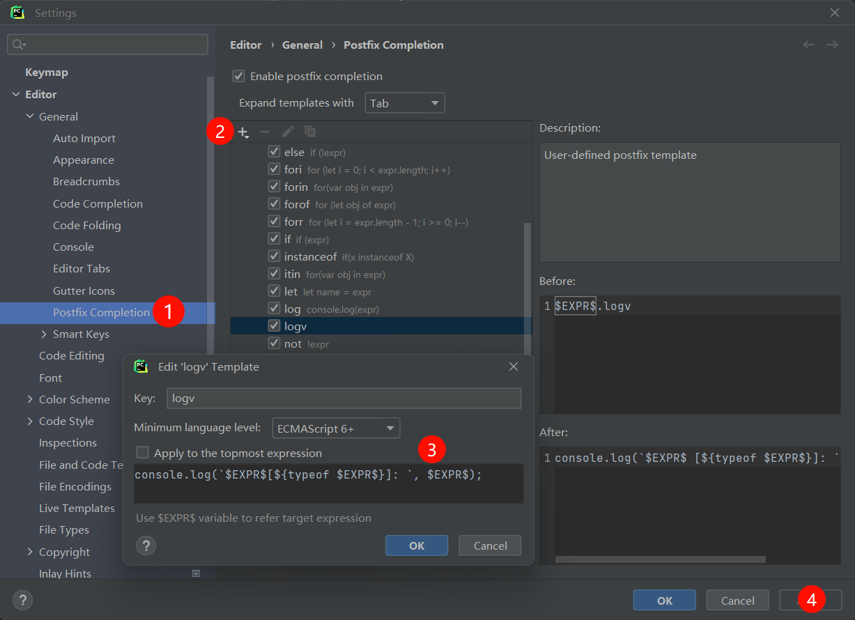 选中自定义的模板组,点击”+”(1.Live Template)来定义模板。